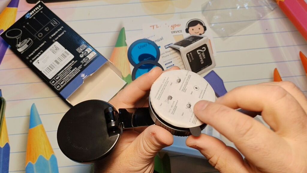 So if you don't have a smartphone or case with MagSafe technology, you can enable the magic using the included accessories. The MSXTTLY phone holder is very well made, in fact it has a nice weight because the structure is almost entirely made of metal, such as the arm with a magnetic surface and a silicone base that won't scratch the smartphone we're attaching it to. On the bottom there is a circular sticker that must be removed before first use and which hides the adhesive suction cup with a slightly rubberized surface, which can also be reused. So when you remove it and perhaps notice it's dirty, you can wash it, let it dry, and the adhesive will be as good as new.