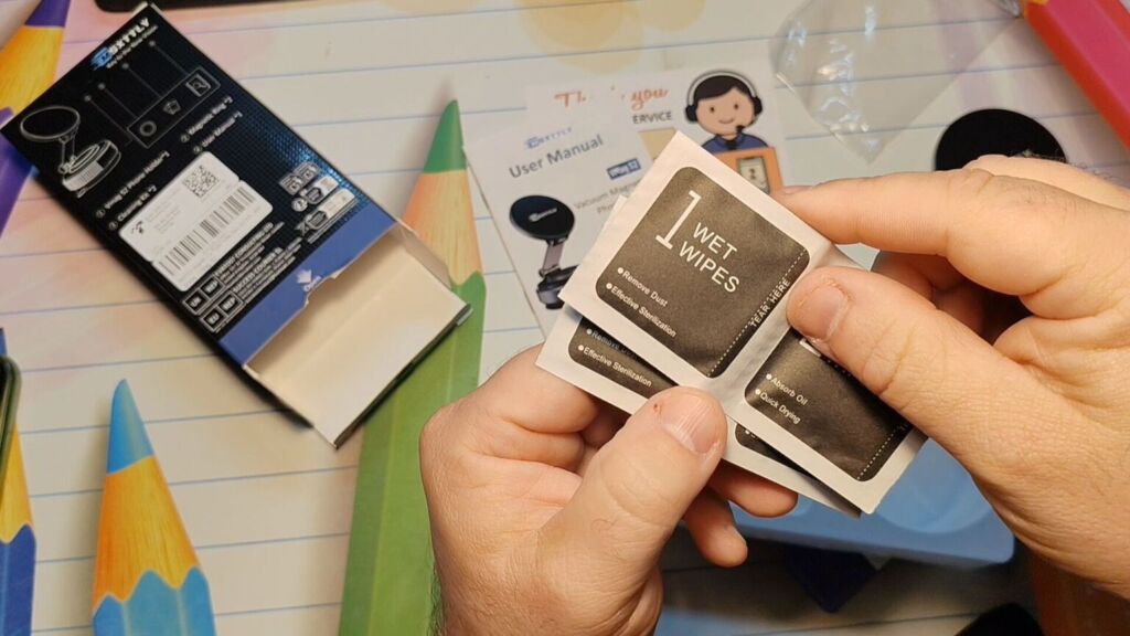 The sales package is eye-catching, starting with the graphics, featuring a carbon fiber-effect texture and some product specifications. Inside, we find a leaflet with a QR code that links to YouTube, where we can watch an installation video and further information regarding the warranty. We also find a small manual, also in Italian, with color images. Finally, we find two adhesive MagSafe rings to transform the current case of our smartphone that doesn't support this technology, as well as cloths for cleaning the surface where we'll attach our gadget.